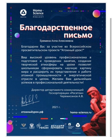 Благодарственное письмо за участие во Всероссийском просветительском проекте Атомный урок, декабрь 2021 |