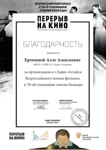 Благодарность за организацию Всероссийского показа фильмов к 78-й годовщине снятия блокады, январь 2022 |