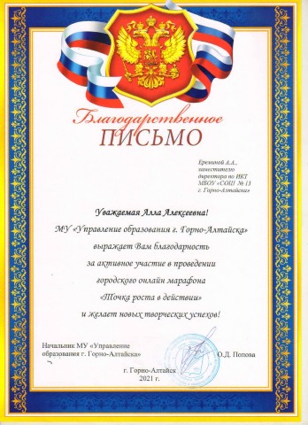 Благодарственное письмо МУ "Управление образования" за проведение городского онлайн-марафона Точка роста в действии, ноябрь 2021 |