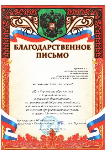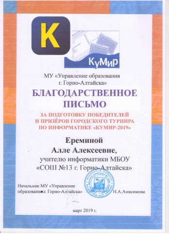Благодарственное письмо МУ "УО г.Горно-Алтайска" за подготовку победителей и призеров городского турнира по информатике Кумир-2019", март, 2019 |