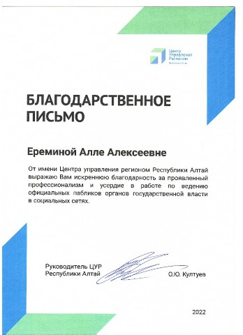 Благодарственное письмо Центра управления регионом РА за проявленный профессионализм и усердие в работе по ведению официальных пабликов органов государственной власти в социальных сетях, 2022 |