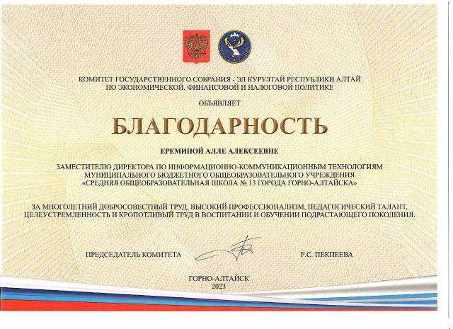 Благодарность Комитета Государственного собрания - Эл Курултай Республики Алтай по экономической, финансовой и налоговой политике за многолетний добросовестный труд, высокий профессионализм, педагогический талант, целеустремленность и кропотливый труд в воспитании и обучении подрастающего поколения, 2023 |
