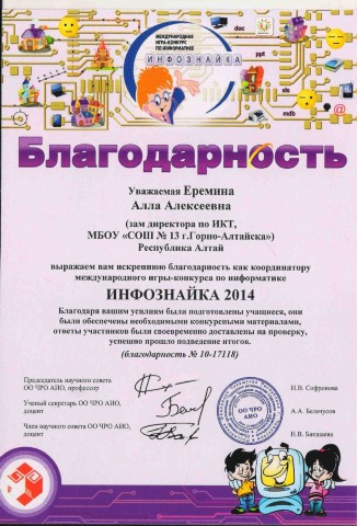 Благодарность координатору международного игры-конкурса по информатике Инфознайка, 2014г |