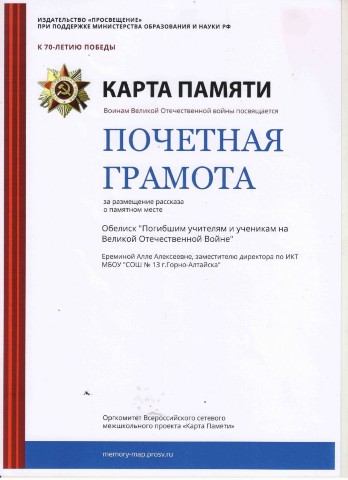 Почетная грамота Всероссийского сетевого межшкольного проекта "Карта Памяти", 2015г |