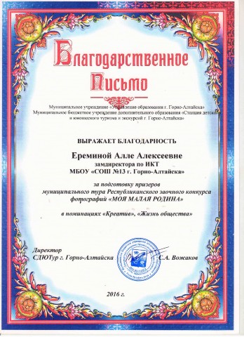 Благодарственное письмо за подготовку призеров муниципального тура Республиканского заочного конкурса фотографий "Моя малая Родина", 2016 г. |