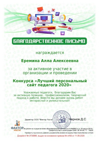 Благодарственное письмо за участие в конкурсе "Лучший персональный сайт педагога 2020", сентябрь 2020 г |