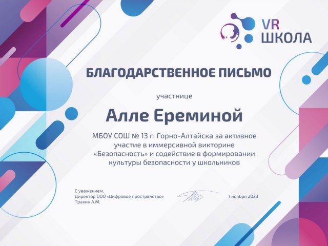 Благодарственное письмо ООО «Цифровое пространство» за активное участие в иммерсивной викторине «Безопасность» и содействие формирование культуры безопасности у школьников (9 класс), 2023г |