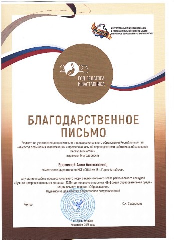Благодарственное письмо БУ ДПО РА «ИПКиППО РА» за участие в работе профессионального жюри заключительного этапа регионального конкурса «Лучшая цифровая школьная команда – 2023» |