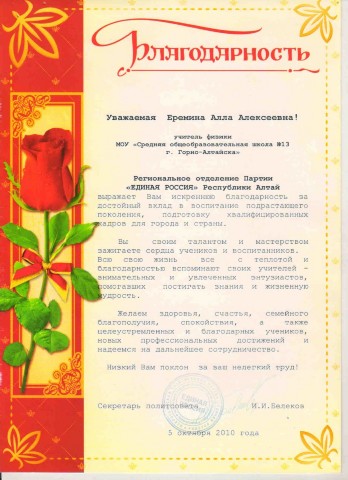 Благодарность Региональное отделение Партии Единая Россия Республикм Алтай, 2010г |