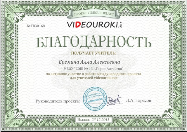 Благодарность за активное участие в работе международного проекта для учителей videouroki.net, 2013г |
