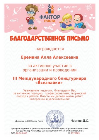 Благодарственное письмо за активное участие III международного блицтурнира Всезнайки, 2015г |