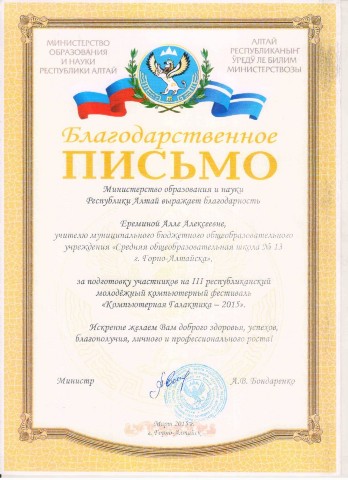 Благодарственное письмо Министерства образования и науки РА за подготовку участников III республиканского молодежного компьютерного фестиваля "Компьютерная Галактика - 2015 |