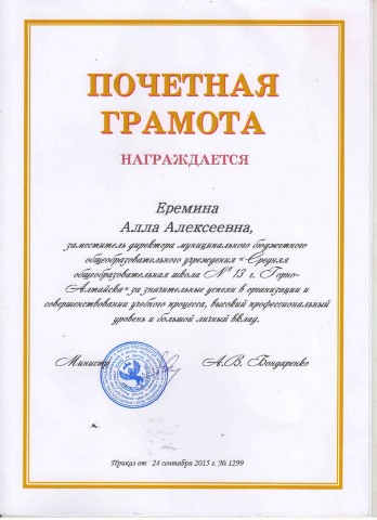 Почетная грамота Министерства образования и науки Республики Алтай, 2015г |