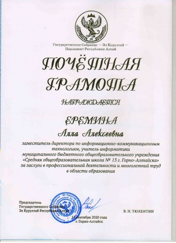 Почетная грамота Государственного Собрания - Эл Курултай - Парламент Республики Алтай, 15.09.2020г |